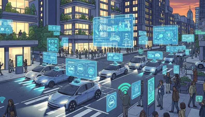Illustration showing autonomous and rideshare vehicles on city streets with digital data overlays